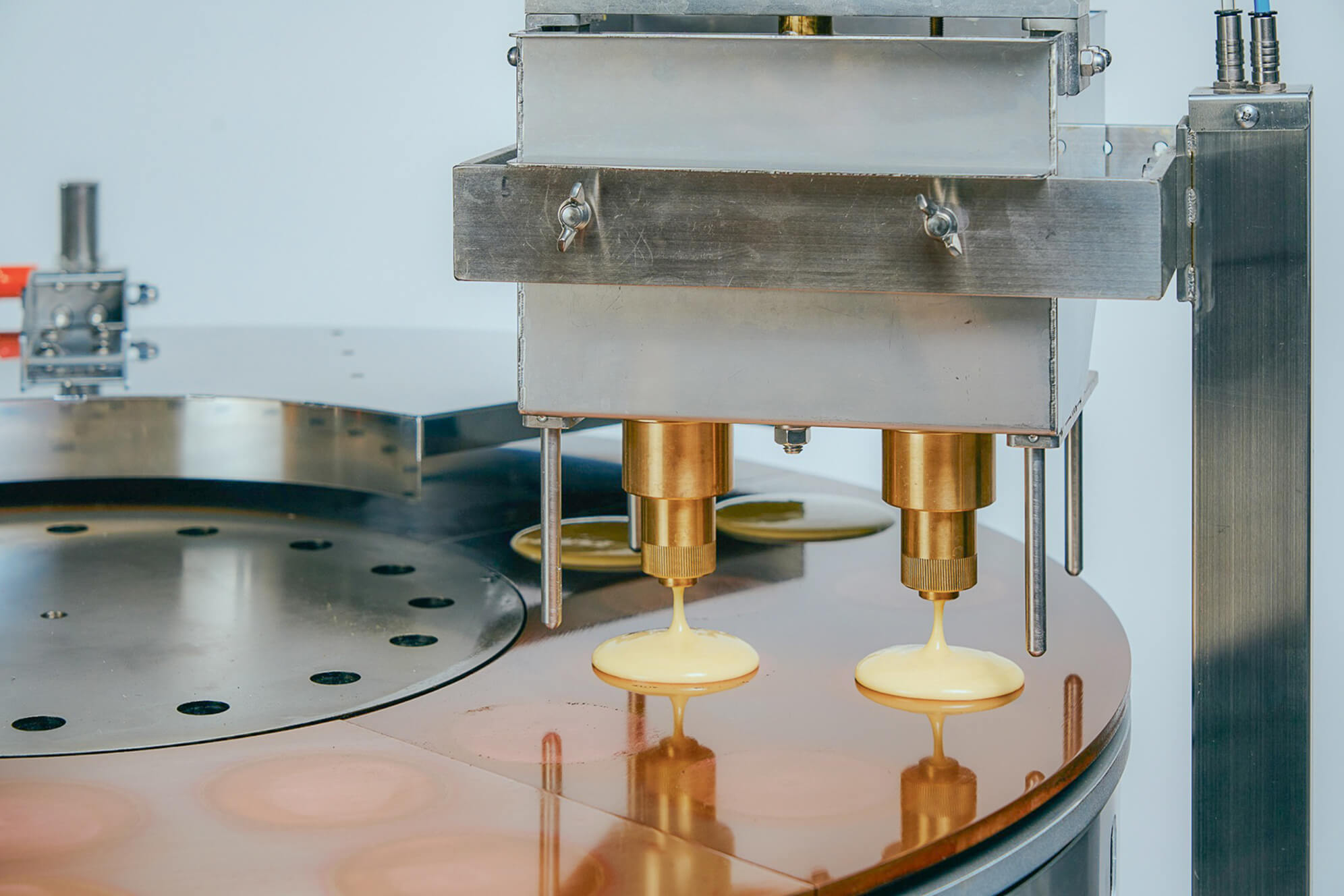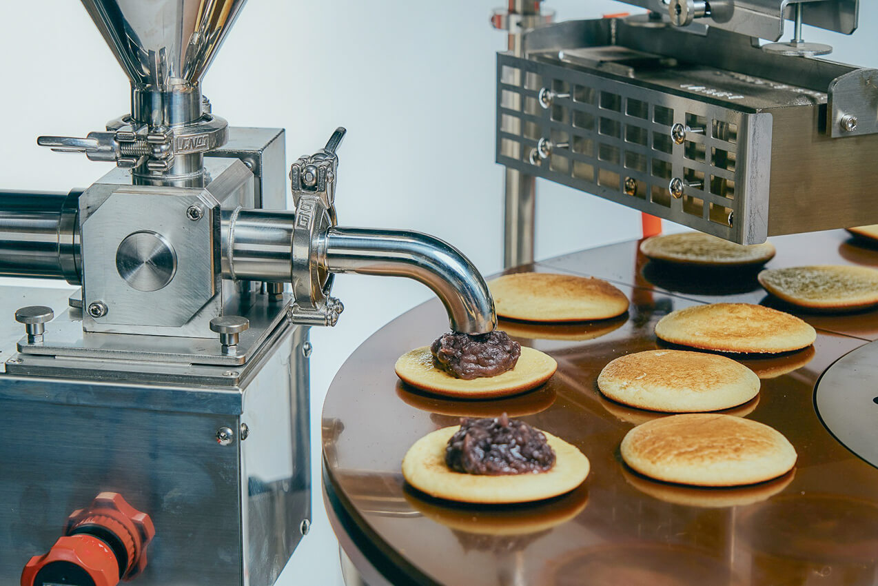餡の自動充填機(オプション)を組み合わせれば、生地落とし・焼成・餡充填・合わせの流れがシームレスに。製造の省力化と一貫性を高め、少人数でも安定した生産体制を実現します。