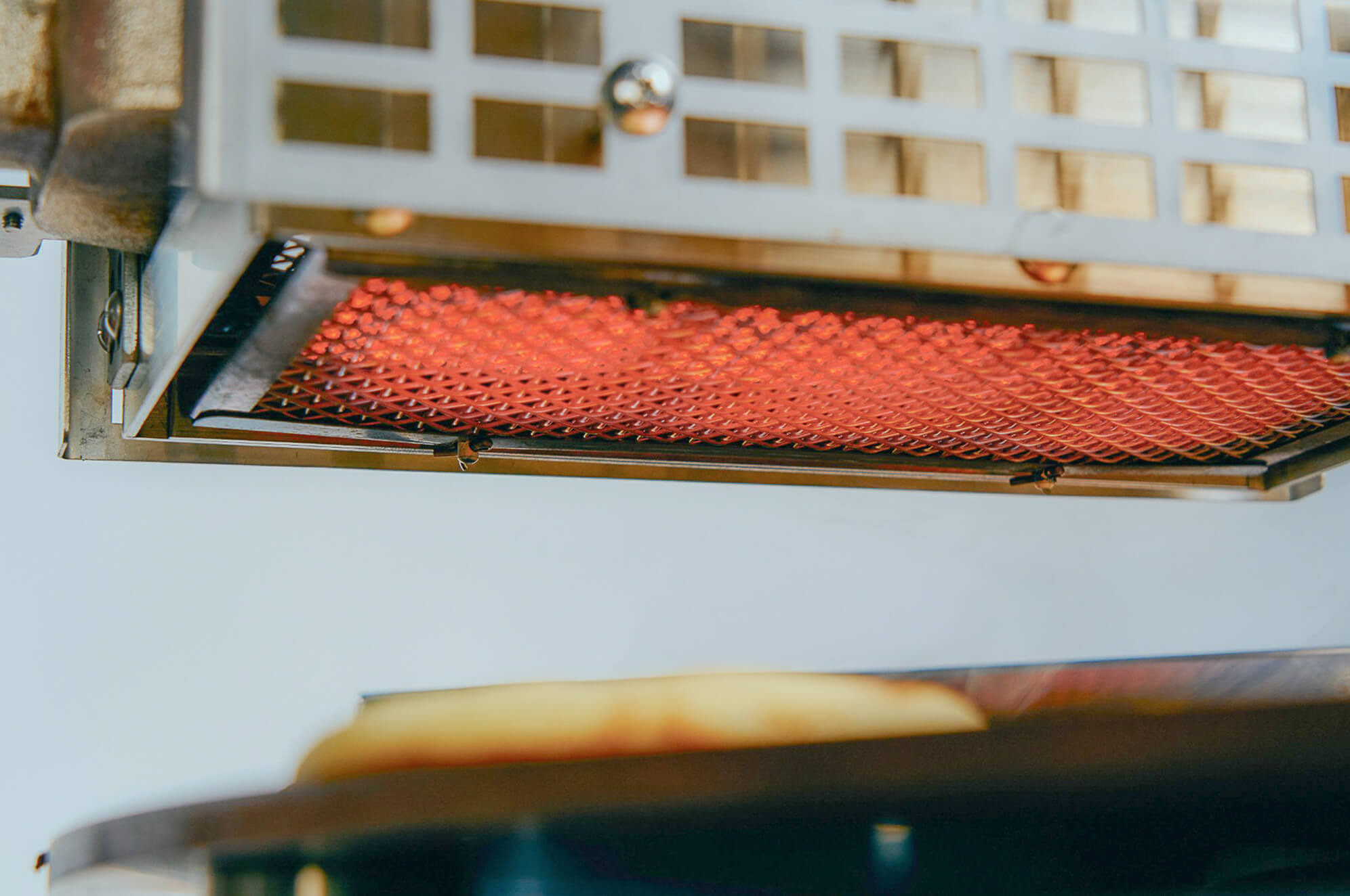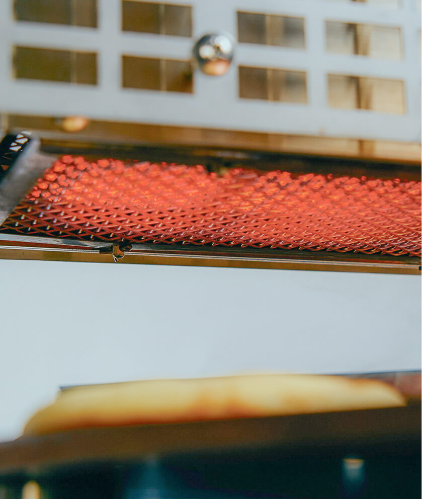下火には銅板加熱用のヒーター、上火には2本組の石英管ヒーターを搭載。ヒーターの傾斜角度を調整ネジで細かく調整できる構造のため、内側・外側それぞれの焼き色バランスを自在にコントロール可能。反転の有無に応じた使い分けもでき、焼きムラのない均一な仕上がりを支えます。