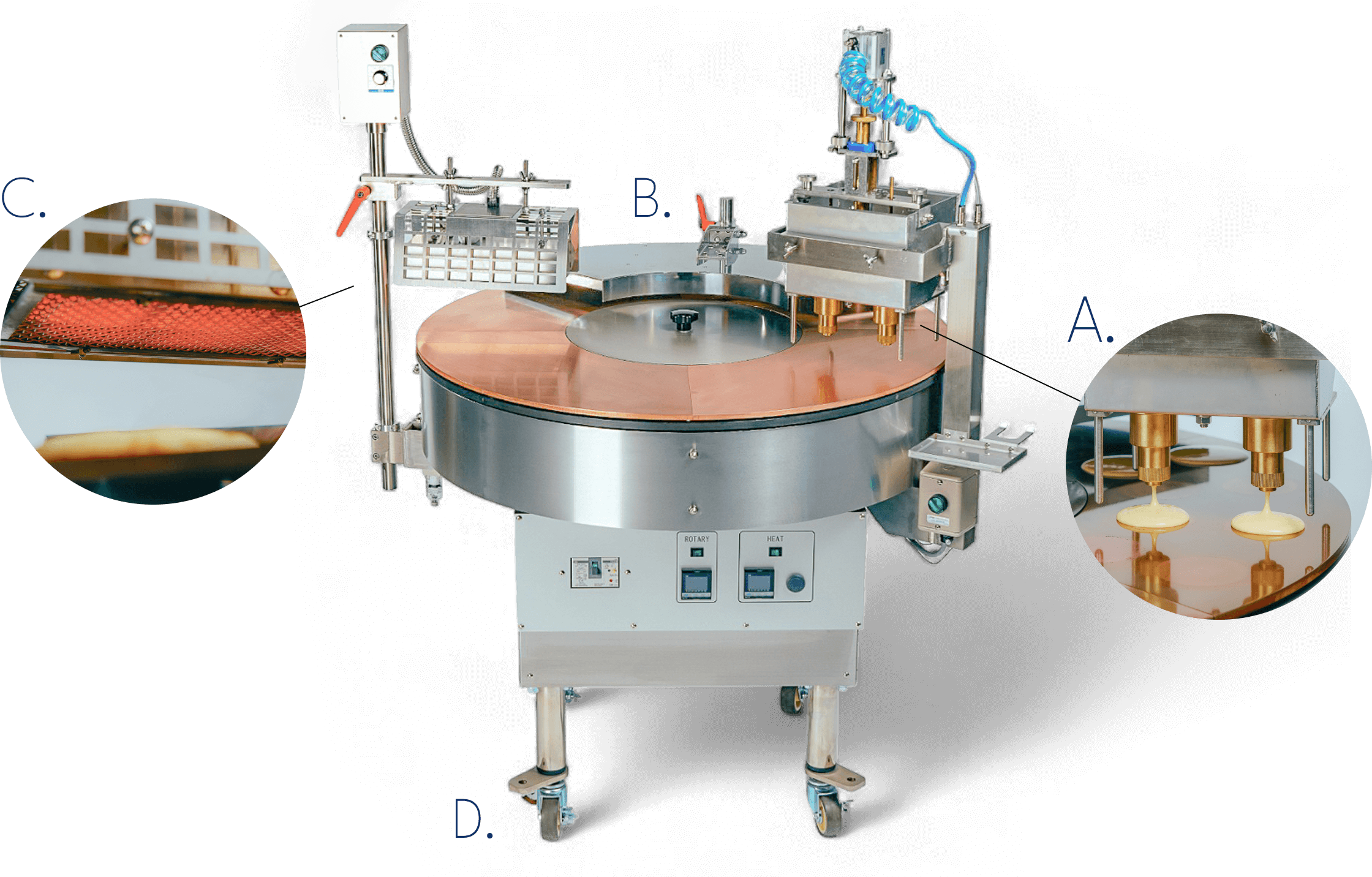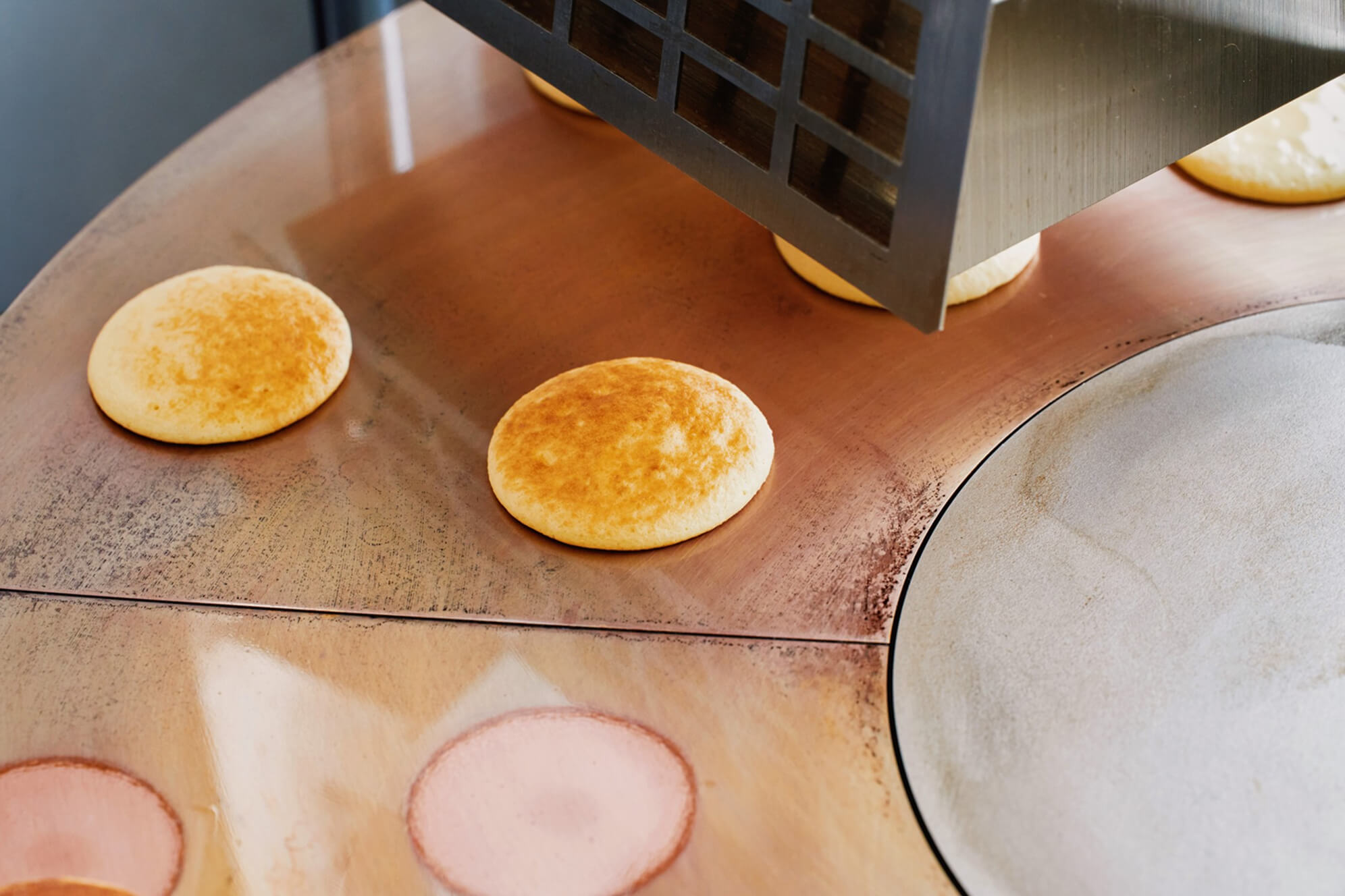 銅板に落した生地は扇型のトンネルを通過し、蒸らし効果でふっくら焼き上げます。また、上火ヒーターとの併用で生地の中心と熱の入り難い縁まわりも生焼けしませんので加熱・殺菌(75° 1分間)の条件もクリア出来ます。